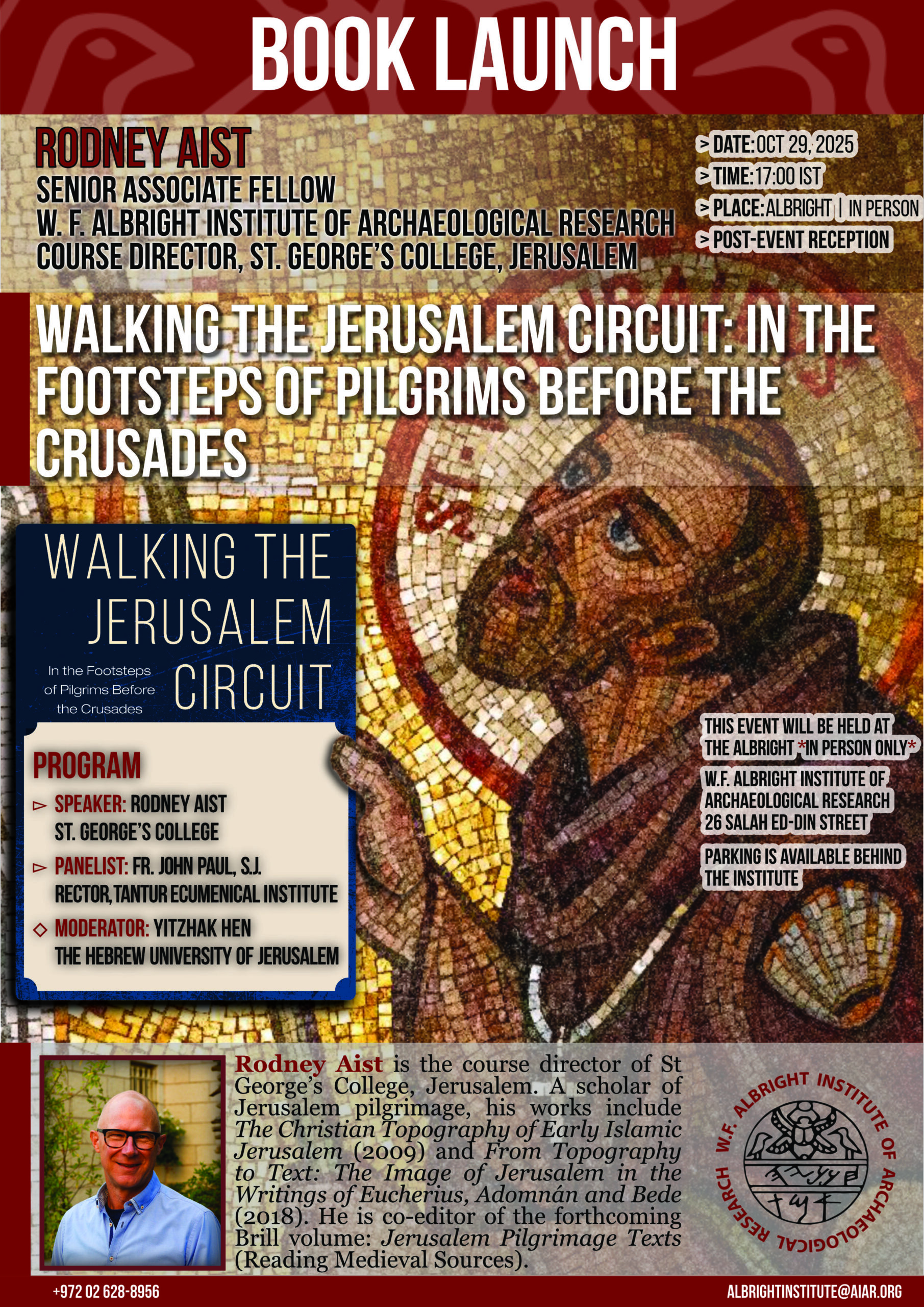 – Oct 29, 2025 – 17:00 – Book Launch – Rodney Aist’s new monograph, Walking the Jerusalem Circuit: In the Footsteps of Pilgrims Before the Crusades. Public Event at the Albright. In-Person only. Download Posters: Digital | Print