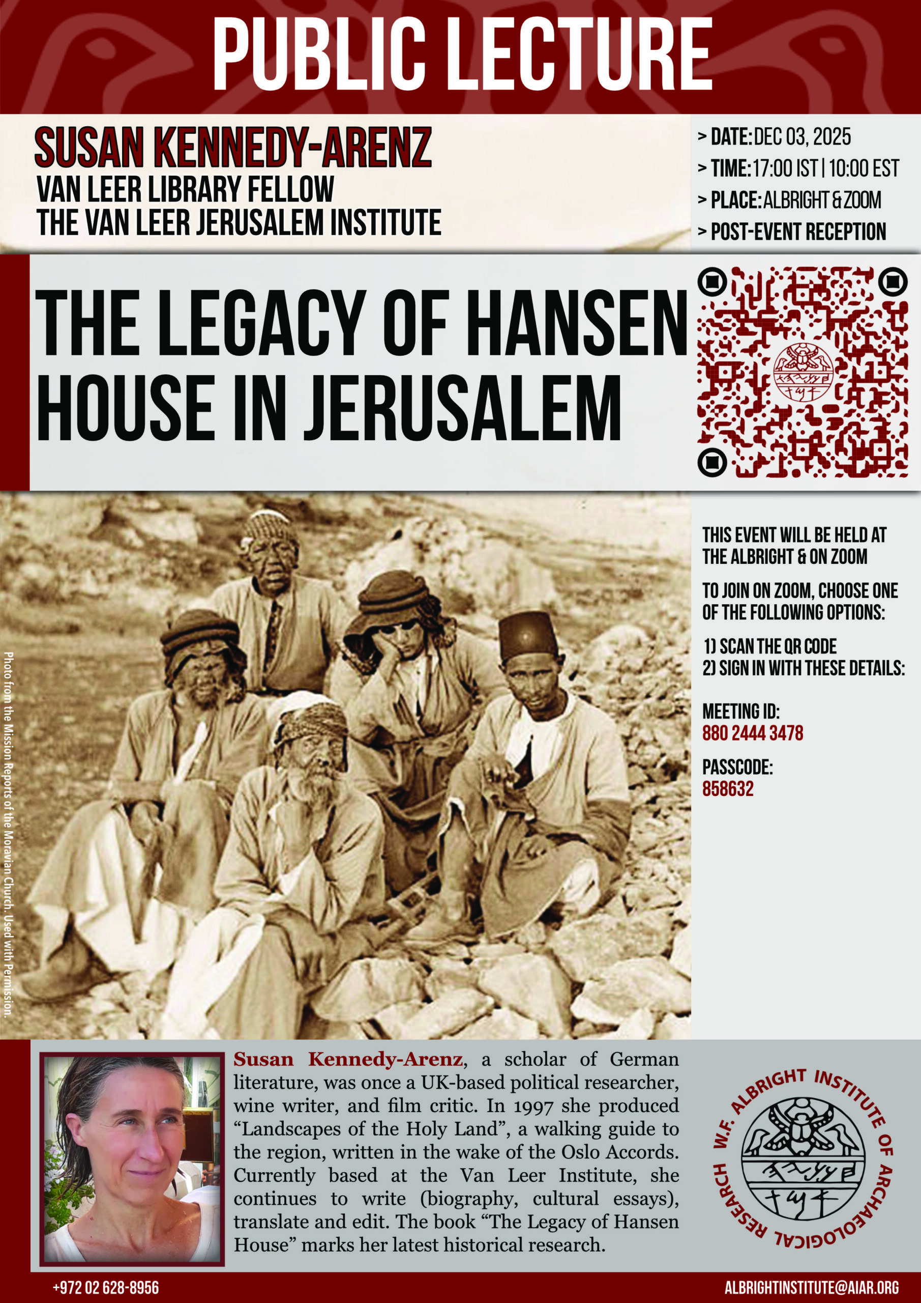 – Dec 3, 2025 – 17:00 – Public Lecture by Susan Kennedy-Arenz – “The Legacy of the Hansen House in Jerusalem.” Public event at the Albright and on Zoom. Download Posters: Digital | Print