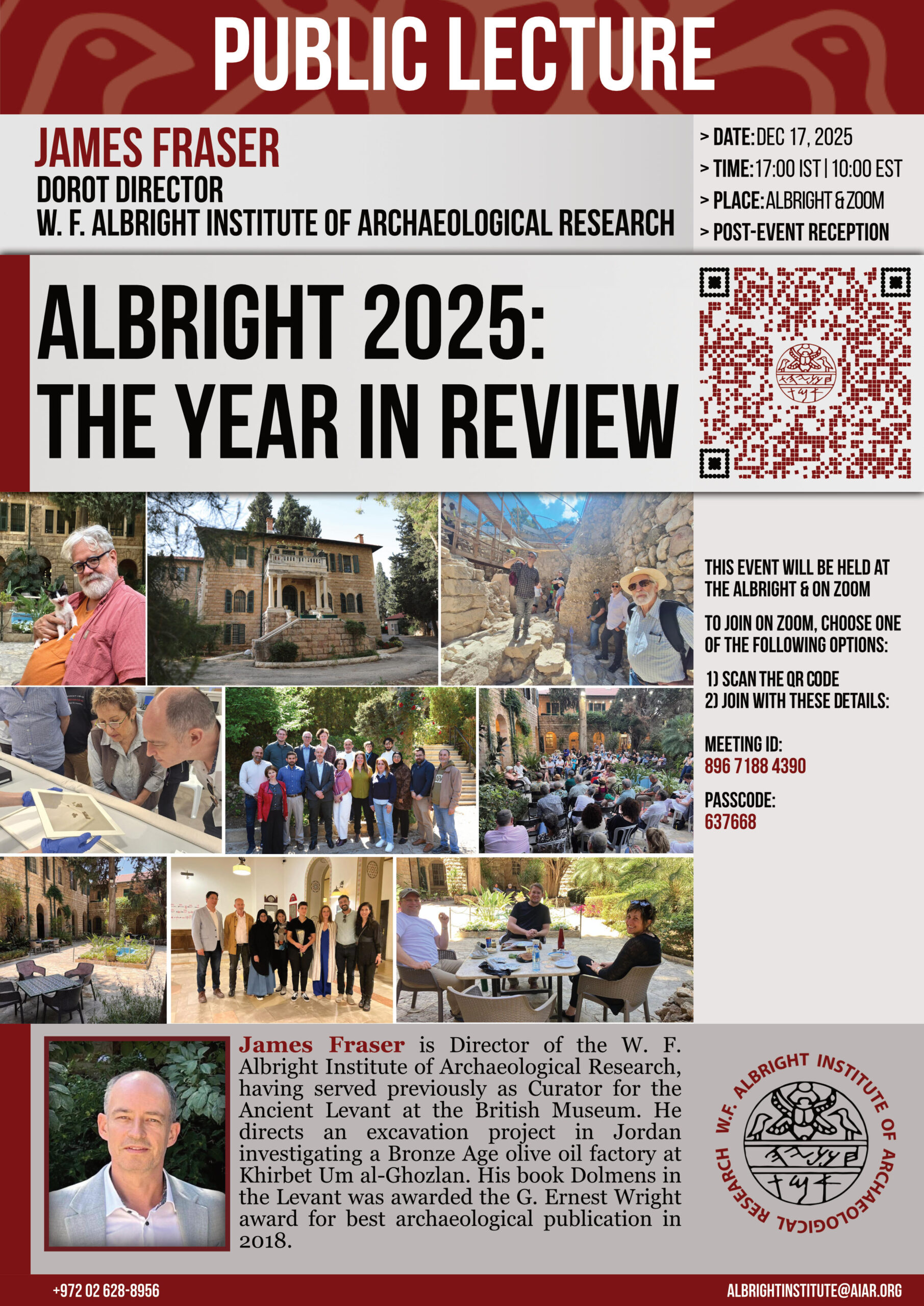 – Dec 10, 2025 – 17:00 – Public Lecture by Shulamit Miller, “The Rise of Christianity in Galilee: A Perspective from the Jewish Cities of Sepphoris and Tiberias.” Public event at the Albright and on Zoom. More details coming soon. Download Posters: Digital | Print