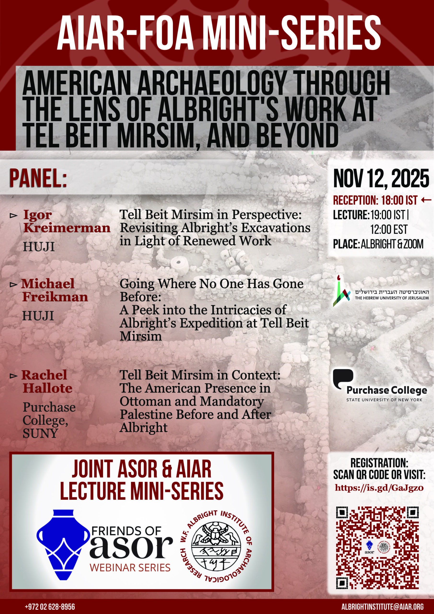 – Nov 12, 2025 – 18:00 Reception; 19:00 ASOR Mini-Series Panel: American Archaeology through the Lens of Albright’s Work at Tel Beit Mirsim, and Beyond. Public event at the Albright and on Zoom. Download Posters: Digital | Print